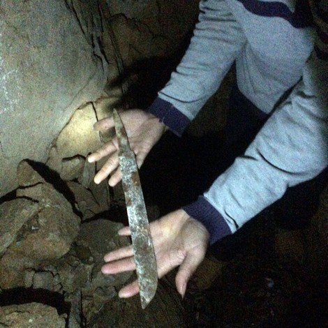 | Thanh kiếm ngắn tìm thấy trong hang vàng đã hoen gỉ, phần chuôi cầm đã bị phân hủy. |