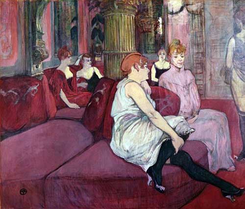 | Họa phẩm "Rue des Moulins" của danh họa Toulouse-Lautrect mô tả nỗi bị sỉ nhục khi các thanh tra y tế kiểm tra sức khỏe của gái mại dâm Paris. |