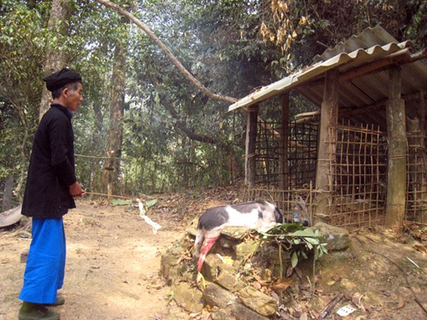 | Màn cầu khấn trước khi bắt đầu lễ "Mể lồ pỉ" của chủ tế trước miếu thờ Thần đá. |