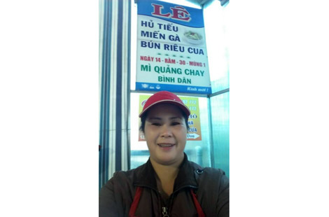 Quán của bà chủ tên Tâm đúng nghĩa là một quán cóc nho nhỏ, xinh xinh nép vào một góc đường với tấm biển cũng nhỏ, xinh nhưng đề khá rõ dòng chữ “quán Lê, phục vụ hủ tiếu, bún… Vào sáng 14, rằm và ngày 30, mùng 1 có phục vụ mì Quảng chay”. Quán nhỏ đó chỉ có một bà chủ quán kiêm luôn người phục vụ. Khách ra vào không ngớt. Bà chủ quán khoác tạp dề đỏ, mặt tươi cười, luôn miệng mời khách và cảm ơn.