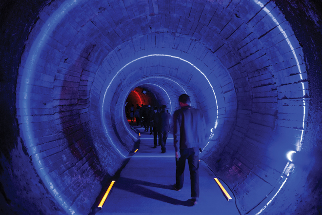 Báo New York Times tường thuật một chuyến tham quan gần đây: nữ hướng dẫn viên Qi Hong mặc quân phục và mang giày bốt quân dụng dẫn đoàn du khách lên xe điện chạy vào một tuyến đường hầm dẫn vào tận giữa núi Kim Tử.