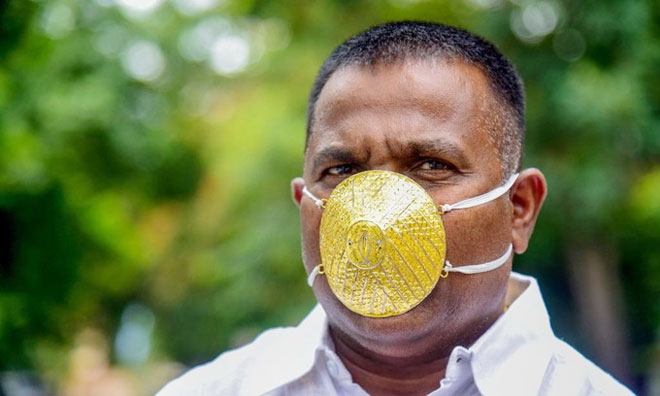 | Doanh nhân Ấn Độ đeo khẩu trang bằng vàng. |