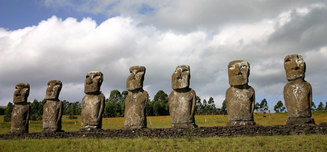 Moai, là những hình người khắc khối của người Rapa Nui trên đảo Phục Sinh ở miền đông Polynesia giữa những năm 1250 và 1500.