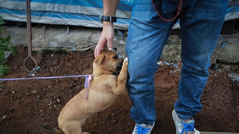 | Hình ảnh chú chó con bị xích cổ đang cố cào chân một du khách để cầu cứu tại lễ hội thịt chó diễn ra ở Ngọc Lâm (Trung Quốc) khiến nhiều độc giả xót xa thương cảm. |