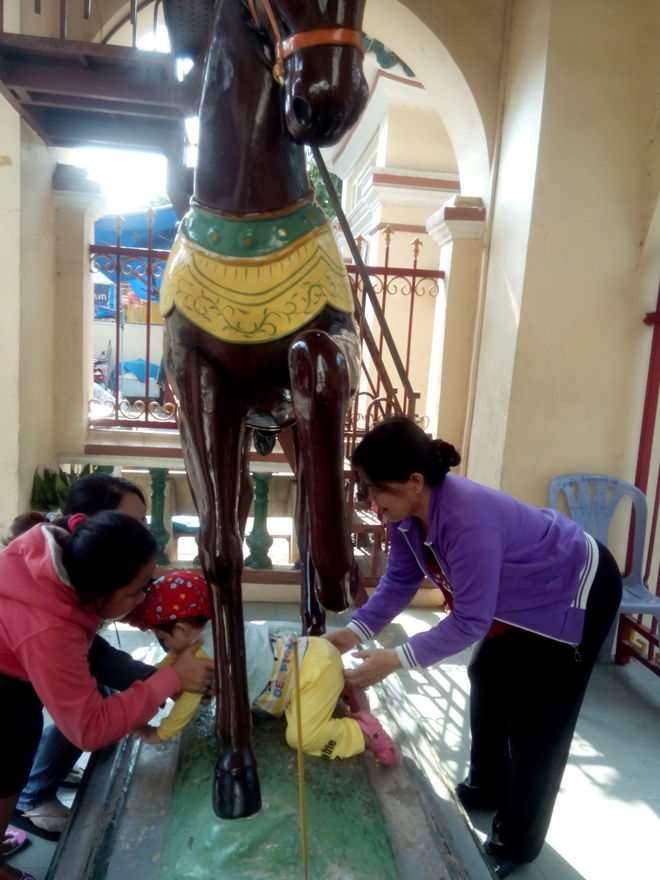 | Khách hành hương tấp nập chui qua bụng Ông ngựa cầu may. |