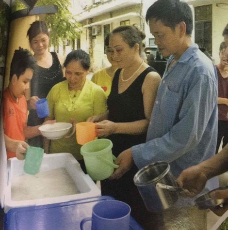 Ở trước nhà hàng số 6 Thuỵ Khuê, anh Hoà cho đặt thùng trà đá gần trăm lít miễn phí, là điểm dừng chân của rất nhiều người lao động nghèo, giúp họ làm dịu cơn khát trong cái nắng oi nồng của mùa hè.