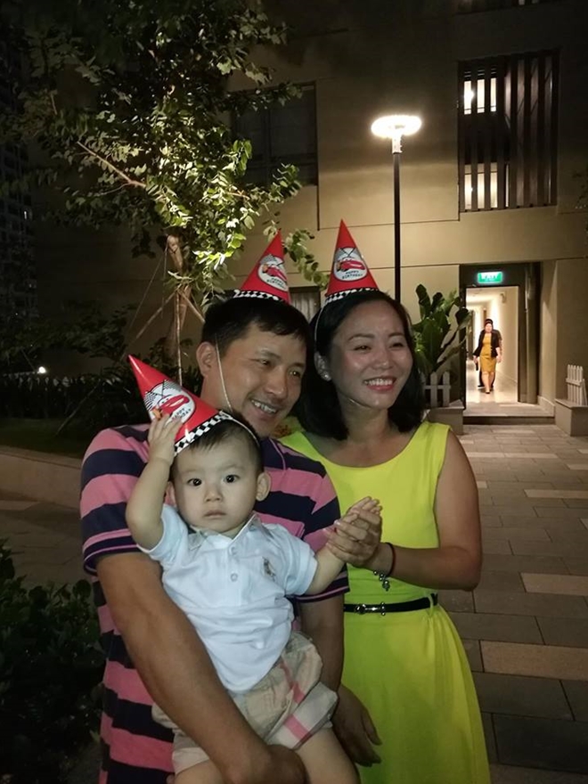 | Oanh cùng chồng và con trai trong sinh nhật bé 1 tuổi. |