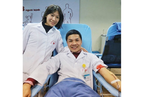 | Bác sĩ Hưng cùng vợ trong một lần hiến máu. |