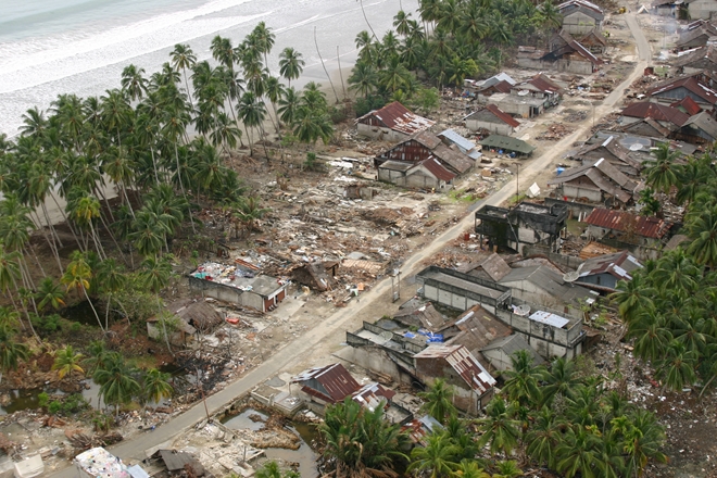 | Một ngôi làng ven bờ biển Sumatra đổ nát sau thảm họa. |