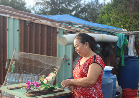 2. Bà Bình chỉ tay sang bên kia, chỉ cách một dải cát "nhàu nhĩ" rác rưởi, nói như than: "Ở làng chài này còn có bà Nguyễn Thị Tuyết (53 tuổi) nữa, cùng cảnh ngộ như tôi". Dõi mắt theo tay bà Bình, không khó để chúng tôi xác định vị trí của người đàn bà tên Tuyết. Chỉ cách một tầm mắt nhưng tôi và Trung tá Mai Văn Thắng phải vòng xe quay lại con đường "xương cá" nhan nhản ổ gà lúc đầu.