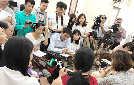 Mẹ cháu bé (tóc dài cột lại) trong nghi án bé lớp 1 bị xâm hại tại TP HCM đang trao đổi với báo chí ở trụ sở của  Hội Bảo vệ quyền trẻ em TP HCM