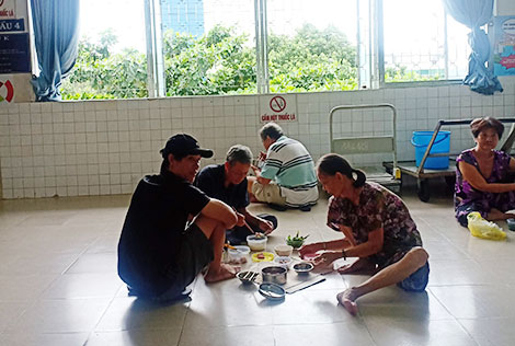 Cảnh bệnh nhân và người nuôi bệnh giăng chỗ sinh hoạt.