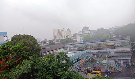 Ngày mưa rả rích, mây đen kéo về nặng trĩu, vẫn có mảng không gian xanh riêng của những cây cổ thụ làm mát không gian bệnh viện, lá cây ướt nước nặng trĩu rơi xuống những dòng chảy dài.