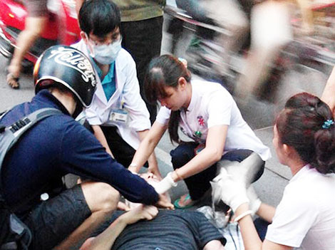 | Sơ cứu người bị nạn trên đường. Ảnh: L.G |