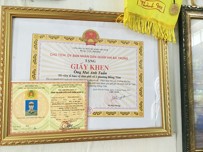 | Giấy khen về thành tích bảo vệ an ninh trật tự khu phố và giấy chứng nhận nhiễm chất độc da cam của anh Mai Anh Tuấn. |