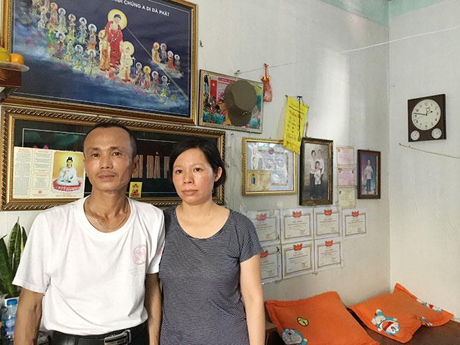 | Vợ chồng anh Mai Anh Tuấn trong căn nhà nhỏ 15m vuông tại xóm chạy thận. |