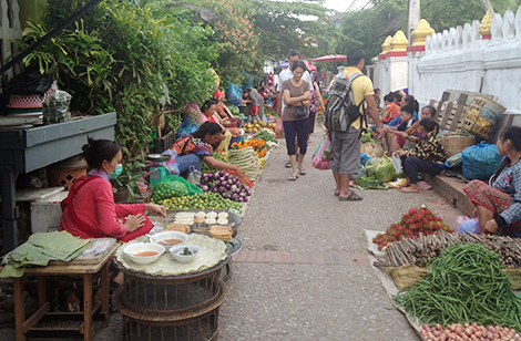 Một con đường cuối phố bán thức ăn cho người Lào đi chợ cuối ngày tìm đến. Sự phục vụ hồn nhiên, ít rào đón, không cúi đầu (cho Tây), lễ độ vừa phải, nhưng thực phẩm luôn tươi rói và thức dùng được gói trong lá chuối, lá dong… tươi cháy xém.