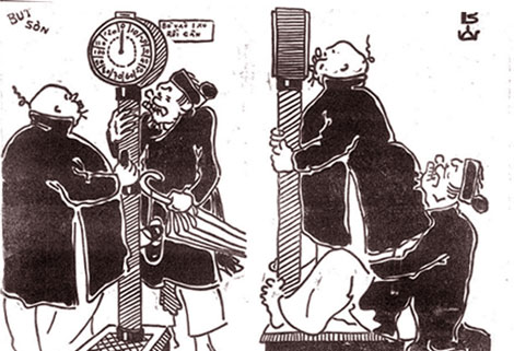 Thật bất ngờ, qua số báo sau, số 89 (16-3-1934) ngay trang bìa đã chọn bức tranh của Bút Sơn. 2 tranh liên hoàn vẽ Xã Xệ và Lý Toét đứng trước cái bàn cân Tây, trên bảng có ghi: "Bỏ vào 1 xu rồi cân". Xã Xệ bảo: "Bác Toét chúng mình có 1 xu làm sao cân hai đứa?". Cả hai cùng leo lên bàn cân, Lý Toét trả lời: "Thế này thì thật nhất cử lưỡng tiện, cân một lần hai đứa rồi chia hai ra thì cũng được chứ lỵ?".
