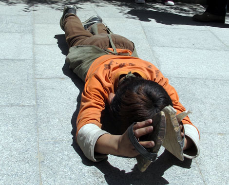 | Cảnh người mộ đạo nằm rạp hàng nghìn, hàng vạn lần mỗi ngày trước cõi thiêng ở Tây Tạng. |