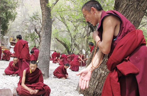 | Các vị sư đọc kinh sách và tranh luận với lòng mộ đạo vô biên. |