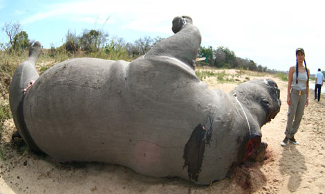 | Ca sĩ Hồng Nhung bên một con tê giác bị giết hại. |