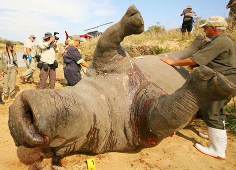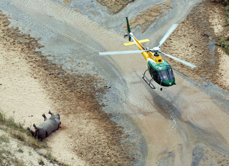 | Tấm ảnh chụp máy bay kiểm lâm châu Phi, bên dưới là xác con tê giác khổng lồ, máu loang trên cát suối. |