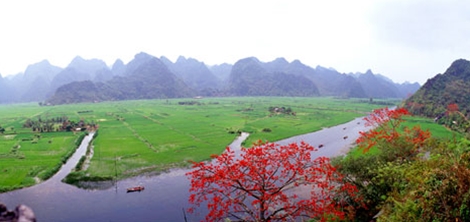 Như một nghệ thuật sắp đặt, những cây gạo dọc theo dòng suối, chạy dài từ bến đò Yến Vĩ đến bến Trò, dưới chân núi, cháy đỏ cả một khoảng trời, như những ngọn nến trời được ai đó thắp lên để khách thập phương dâng hương lên Phật bà Hương Tích. Những ngọn nến trời mộc miên thắp suốt cả mùa hội. Tôi đã hỏi vị sư trụ trì chùa, Đại đức Thích Minh Hiền, rằng ai trồng những cây gạo ấy? Và từ bao giờ?