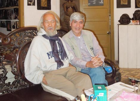 Nhà điêu khắc Phạm Văn Hạng (bên trái) và tác giả.