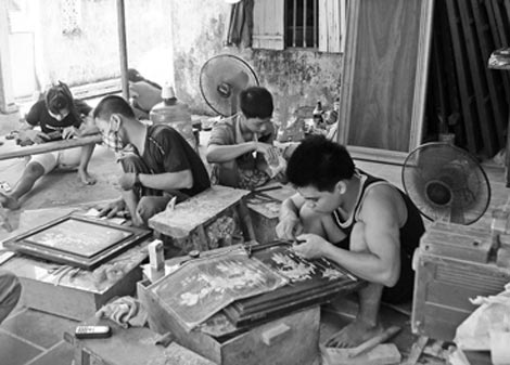 Sau đó anh dẫn tôi ra phân xưởng xem những người thợ trẻ đang cặm cụi làm việc. Vợ anh đang chăm chú đục nét theo bản vẽ của anh về đề tài Hồ Gươm và thiếu nữ Hà Nội. Con trai anh lại cùng với mấy người thợ thực hiện cưa những đường nét nhỏ xíu vẽ nên đường cong của người con gái. Anh khoe mình đang thực hiện một bức khảm đầy ngẫu hứng về hình ảnh thiếu nữ Hà thành xưa. Đó là những nhan sắc đôn hậu dịu dàng của mấy cô gái đang ngồi trên chiếc xe xích lô dạo quanh Hồ Gươm. Anh là người tạo hình và sẽ là người cuối cùng hoàn thành nó ở công đoạn tỉa họa tiết, tách hình rồi xoa bóng cho nổi mầu sắc của nguyên bản những con ốc mầu đỏ hay những con bào ngư lung linh, tạo nên chất sang trọng và thanh lịch Tràng An.
