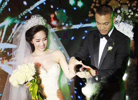 | Quỳnh Nga và Doãn Tuấn trong đám cưới. |