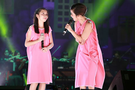 | Ca sĩ Mỹ Linh và con gái Mỹ Anh trình bày ca khúc “đưa cơm cho mẹ đi cày” của nhạc sĩ Hàn Ngọc Bích trong Chương trình Giai điệu tự hào. |
