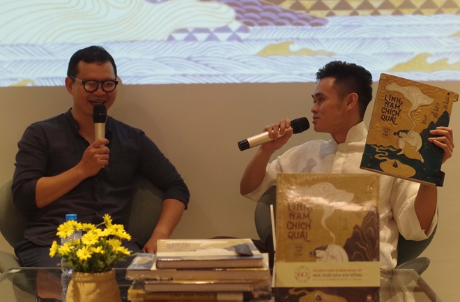 | Họa sỹ Tạ Huy Long giao lưu với bạn đọc xung quanh ấn bản "Lĩnh Nam chích quái" vừa phát hành. |
