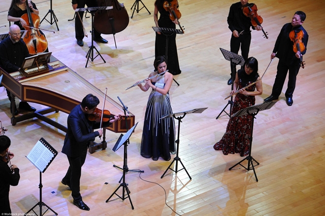| Nghệ sỹ flute Lê Thư Hương biểu diễn cùng dàn nhạc. |