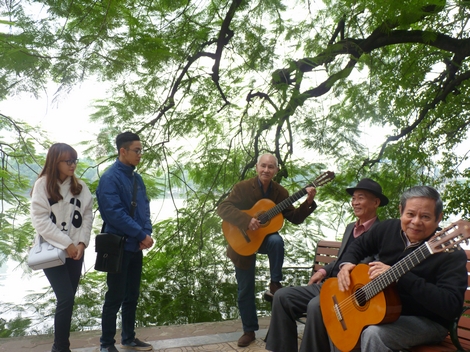 | Nhóm “Thất cầm” còn lại 4 nghệ sĩ, trong đó 3 nghệ sĩ còn khỏe, thi thoảng chơi ghita ở Hồ Gươm. |