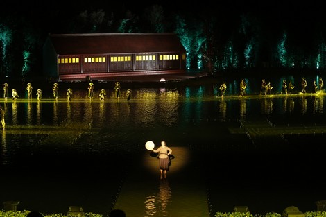 + Đó là một câu chuyện khá dài kỳ. Ý tưởng làm show diễn kiểu như thế này đã xuất hiện trong đầu tôi vài năm trước, nhất là sau kỳ Olympic ở Trung Quốc, đạo diễn Trương Nghệ Mưu đã dàn dựng với diễn viên quần chúng của ông ấy, tôi tự hỏi tại sao cùng chất liệu dân tộc, mà Trương Nghệ Mưu làm ra những sản phẩm đẹp, gây sốc về thị giác như thế.