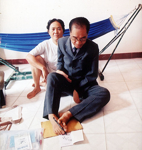 Nguyễn Ngọc Ký dùng chân pha trà và rót trà, rồi cười: “Bây giờ tớ là anh giáo về hưu, làm tư vấn mỗi phút được 1.000 đồng. Vừa giúp người vừa giúp mình, mỗi tháng kiếm được mấy triệu để trang trải chi phí chống chọi với bệnh thận!”.