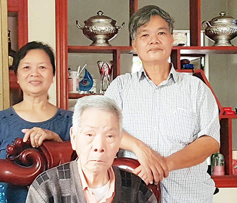 | Cụ Đoàn Trấn và vợ chồng người con trai. |