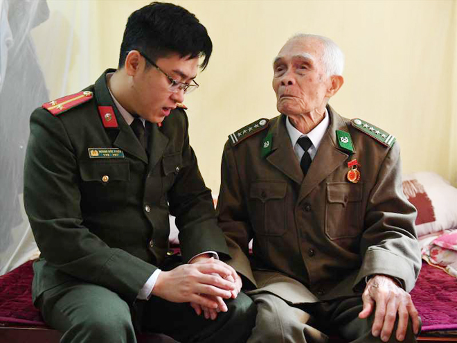 | Đại tá Hoàng Long Xuyên và cháu nội hiện công tác tại Công an tỉnh Thái Nguyên. Ảnh: Việt Văn. |