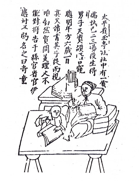 | Tranh dân gian về Kỳ Đồng được công bố tại Paris năm 1909, vẽ cảnh Kỳ Đồng ngồi nghe cha đọc sách và dò theo chữ. |
