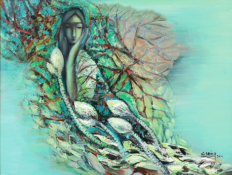 | “Thiếu nữ với sen” - sơn dầu của A Sáng. |