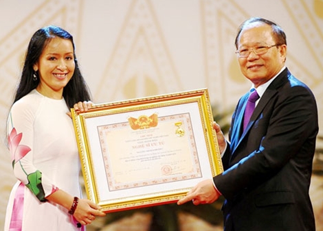 | Hải Phượng trong buổi phong tặng danh hiệu “Nghệ sĩ ưu tú”. |