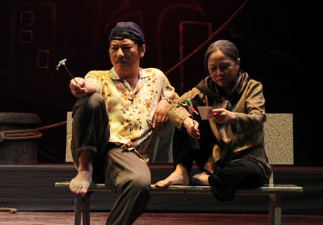 | Cảnh trong vở "Rau răm ở lại" - một trong những vở diễn mới xuất sắc của sân khấu Hoàng Thái Thanh. |