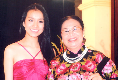 | Bà Đoàn Thị Nguyên và Hoa hậu Thùy Lâm khi làm phim "Tây Sơn hào kiệt". |