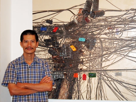 | Họa sĩ Nguyễn Ngọc Dân và tranh dây điện. Ảnh: Trần Nam Triệu. |