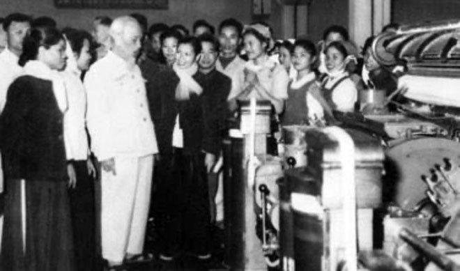Bà Thái Bảo giới thiệu với Chủ tịch Hồ Chí Minh khi Người về thăm Nhà máy dệt 8-3. (Tư liệu gia đình)