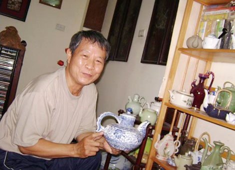 | Nhà thơ Vương Tâm bên bộ sưu tập rất nhiều ấm chén của ông. |