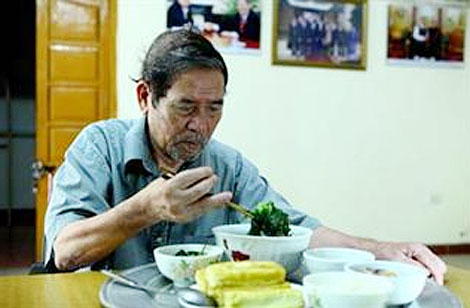 | Nhà văn Lê Lựu bên mâm cơm. |