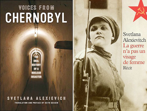| “Chiến tranh không có khuôn mặt phụ nữ” (phải) và “Những tiếng nói từ Chernobyl” (trái) là hai trong số nhiều tác phẩm xuất sắc của nữ văn sĩ Alexievich. |
