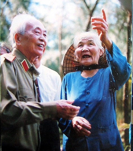 | Đại tướng Võ Nguyên Giáp thăm Anh hùng Lao động Phạm Thị Nghèng, người trồng hàng triệu cây rừng chắn cát ở Quảng Bình. |