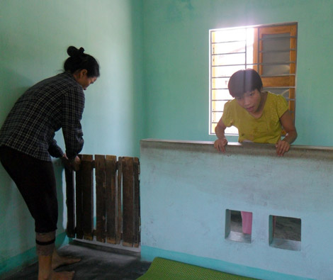 Chia sẻ về cuộc sống hiện tại, chị Minh nói: “Tôi xin đi làm thêm đủ nghề để lo cho các con chứ ở nhà không thì không có tiền”. Dẫn chúng tôi đi xuống nhà dưới, chị Minh chỉ cho chúng tôi thấy một góc nhà được xây bức tường cao khoảng 1,5 mét, có cửa gỗ nhỏ. Chị Minh bùi ngùi: “Cứ mỗi lần tôi đi làm là đưa đứa con gái vào khoá lại. Vì con bị bại não nặng nên cứ hay đập phá, cười khóc suốt. Sợ nguy hiểm cho con nhưng chẳng còn cách nào giữ con như vậy. Còn đứa con trai út bị bệnh nhưng nhẹ hơn, tôi khoá cửa ngoài để cháu đi lại trong nhà”.